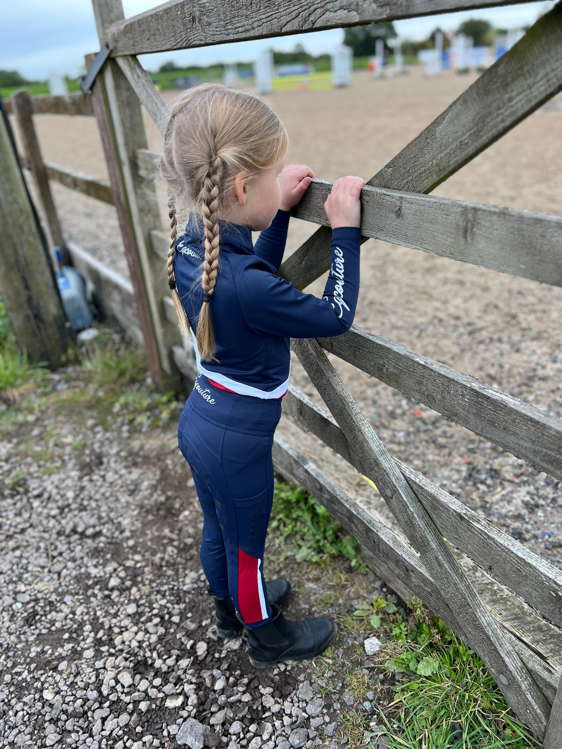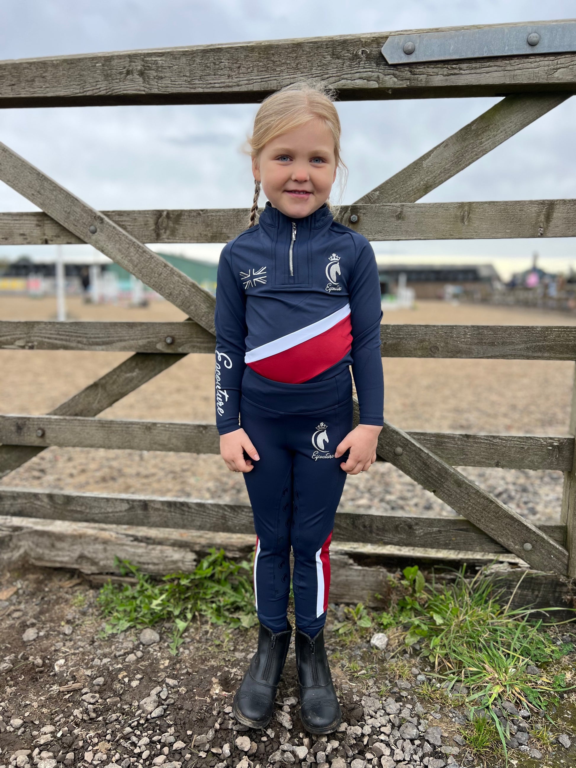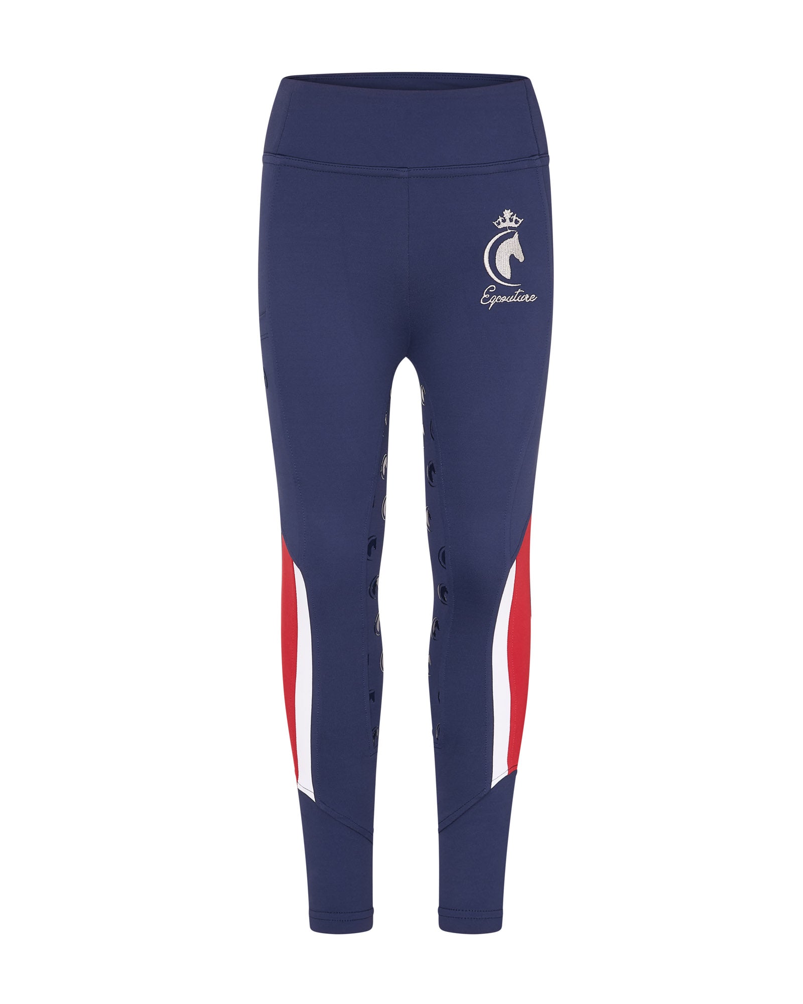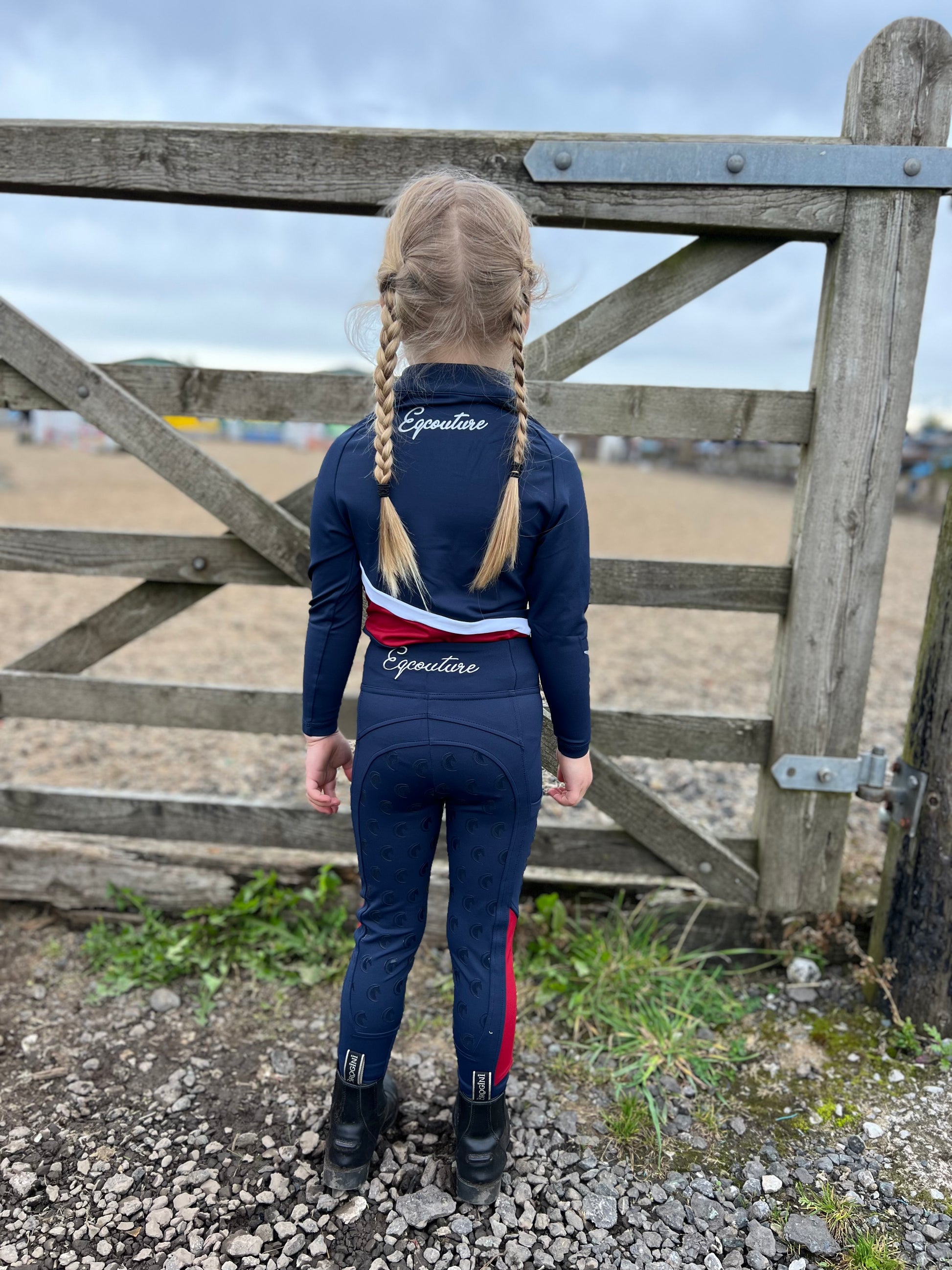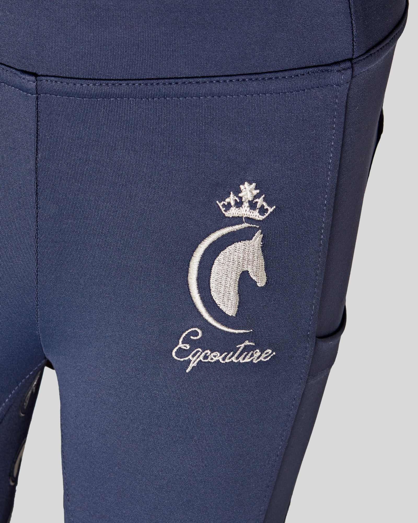 NAVY Original Style Extremely comfortable, bodyforming and super soft riding leggings. Featuring a full seat silicone grip with the unique Eqcouture logo pattern to keep your child secure in the saddle. Includes a phone pocket / sweet pocket on both sides for use around the yard and safety whilst riding. Our leggings are not thin material they are thick, high quality, fast drying material.
