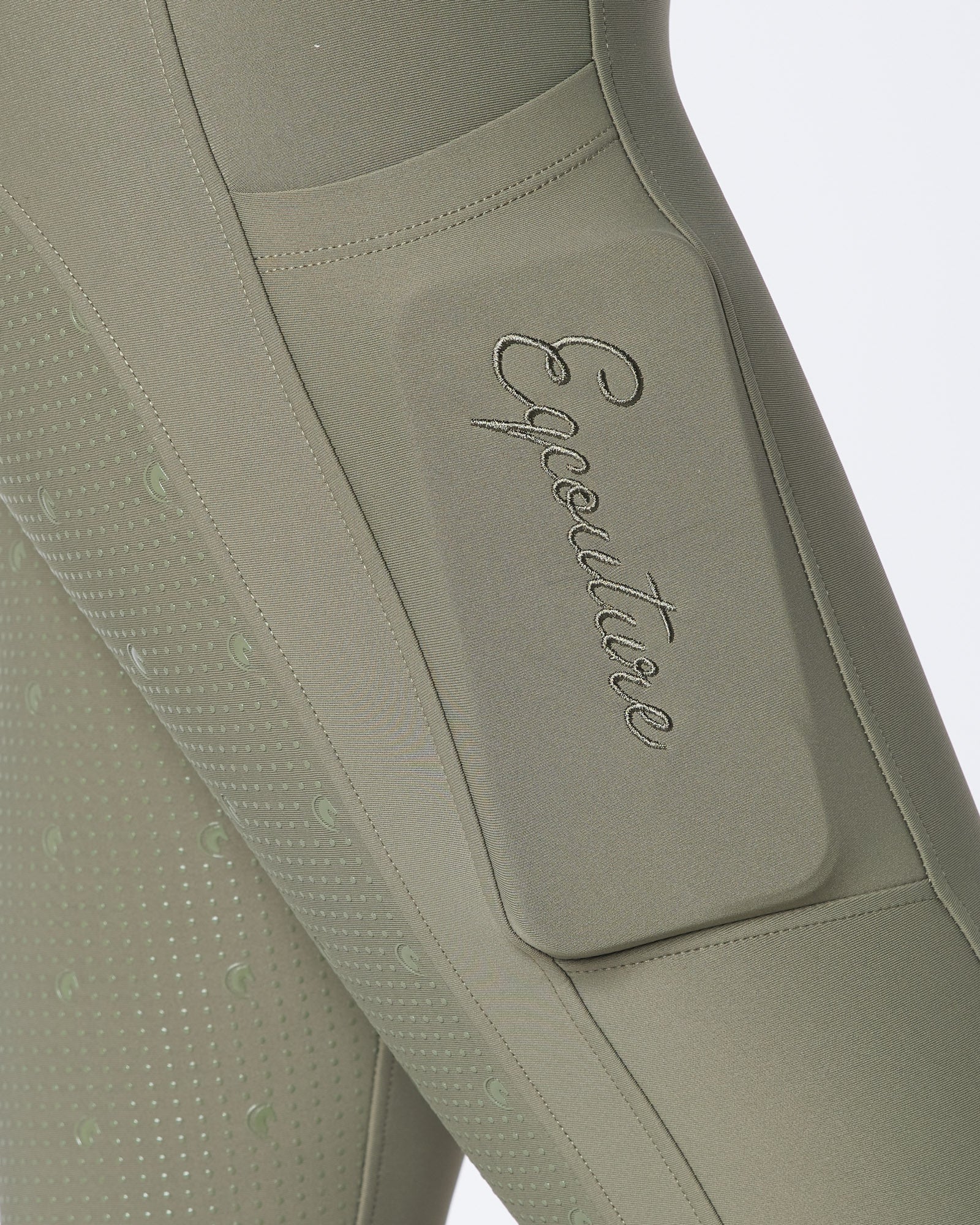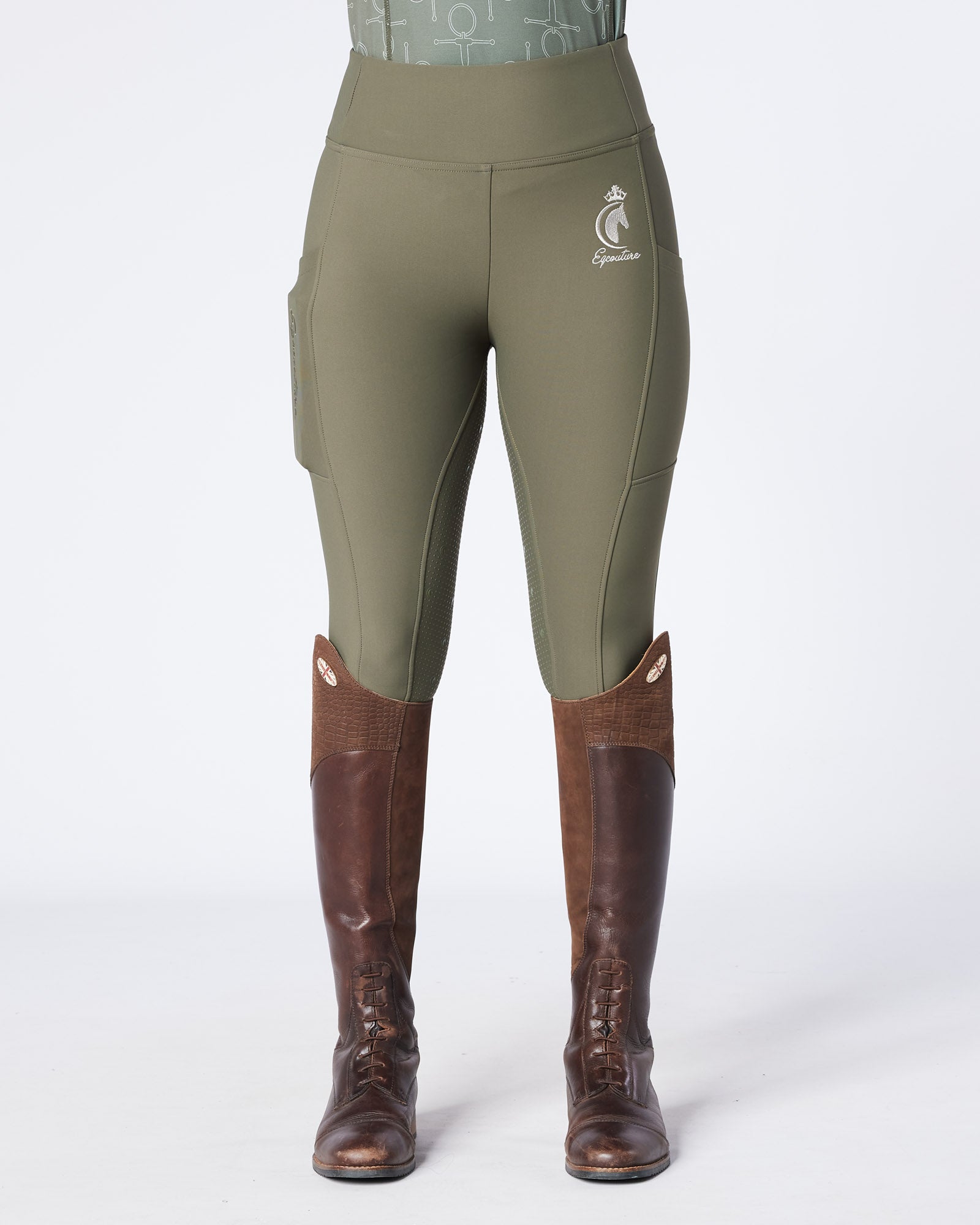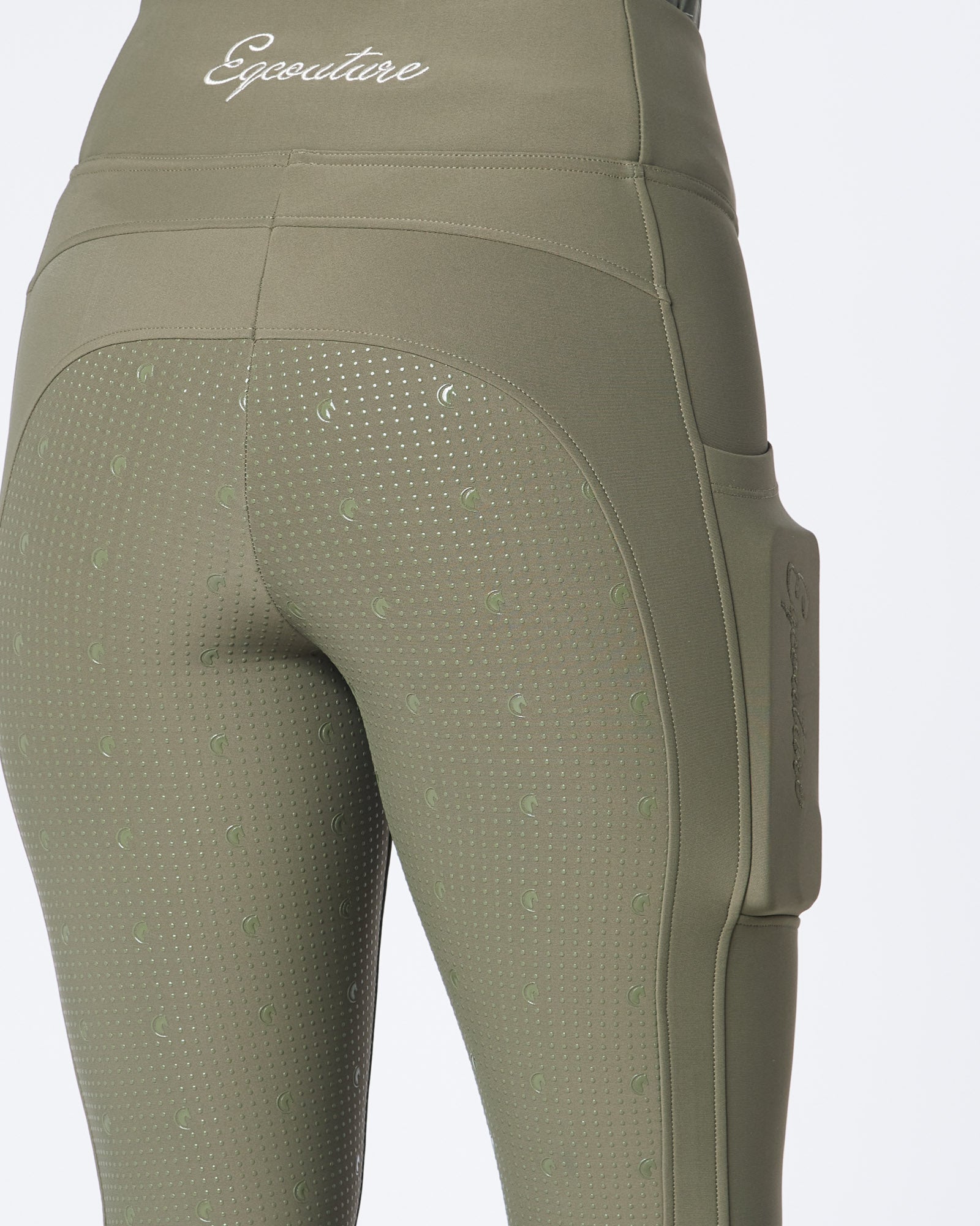 WINTER OLIVE GREEN - Extremely comfortable, bodyforming and super soft riding leggings. Featuring a NEW DESIGN full seat silicone grip with the unique Eqcouture logo pattern to keep you secure in the saddle. These leggings will not only improve your stick-ability in the saddle but the body forming material will enhance your body shape! The 3'' embroidered waist band is wide and high keeping everything just where you want it. Includes deep phone pockets on both sides for use around the yard and safety out riding. Our leggings are not thin material they are thick, high quality, fast drying material. Our embroidered logos mean you do not have to worry about it rubbing off!